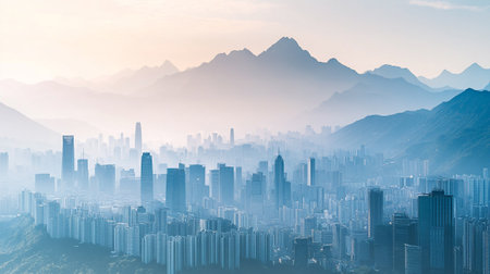Hong Kong cityscape with skyscrapers and mountains at sunrise.