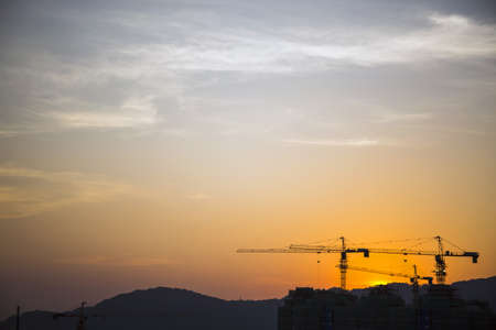 the photograph shows two construction cranes in housing starts. Sunset. In the background mountains.