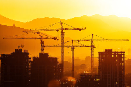 Cranes rise high over an active construction site at sunset, with city buildings and silhouettes in the background, showing urban development efforts.