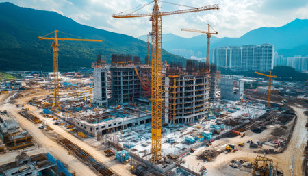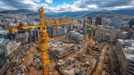 This aerial photograph showcases a bustling construction site featuring cranes amidst a lively urban landscape. Workers and machinery are visible, highlighting the complex process of building and development.