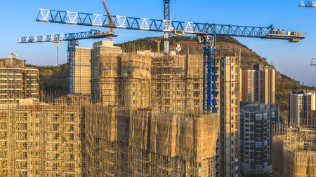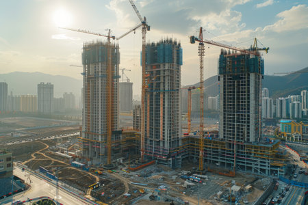 Captivating view of a construction site showcasing modern apartment buildings with cranes and scaffolding under a dramatic sky, ideal for urban development themes.