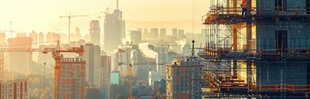A cinematic photorealistic construction site with cranes, high rise buildings, sunrise, urban city