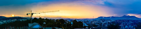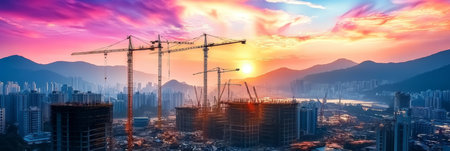Stunning Panoramic View of Construction Site with Cranes, Urban Landscape, and Sunset Skies