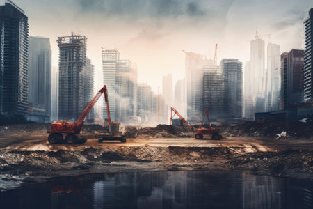 Vibrant urban construction site tall buildings, heavy machinery, and dusty mud roads under sunlight