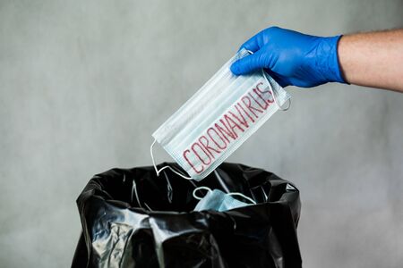 Corona virus or covid-19 protection concept. Male hand in latex surgical disposable glove throws in trashcan used medical mask against coronavirus. Outdoor background.