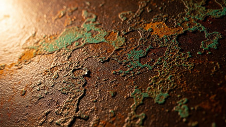 Macro view of a rusty metal surface showing peeling paint and green corrosion patches, creating a textured abstract background.