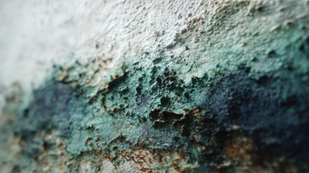 Detailed examination of a walls surface reveals textures created by moisture, showing green and blue tones from organic growth and wear over time.