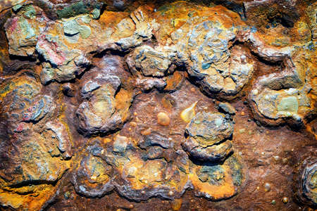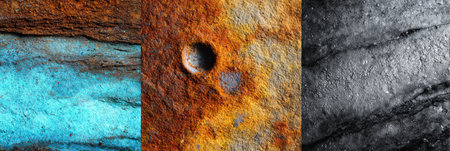 Various surfaces of rust, mineral formations, and stone are displayed, highlighting natural textures and colors in an outdoor setting illuminated by daylight.