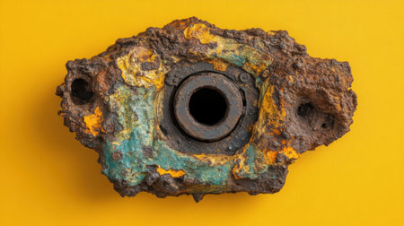 A close-up image showcasing a rusty circular metal ring against a vibrant yellow background, illustrating texture, decay, and weathering. Perfect for industrial themes.