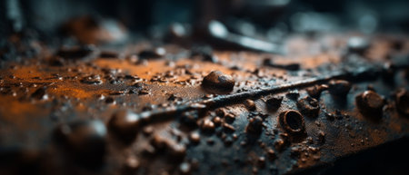 Close-up view of a weathered metal surface showing rich hues of rust and dark droplets pooling across its textured landscape, capturing the interplay of light and shadow.