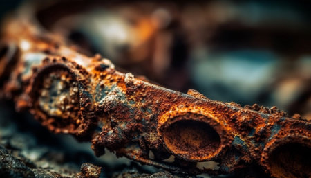 Close-up view of a weathered and rusty pipe fitting, revealing the intricate textures and colors formed over time in a derelict industrial setting, whispering stories of past operations.