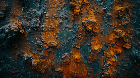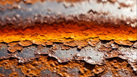 Detailed macro view of a heavily corroded metal surface with peeling layers of rust in vibrant orange and brown hues.