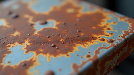 Close-up shot capturing the beauty of rust oxidation on a textured surface. The combination of blue and rust creates an interesting visual effect.