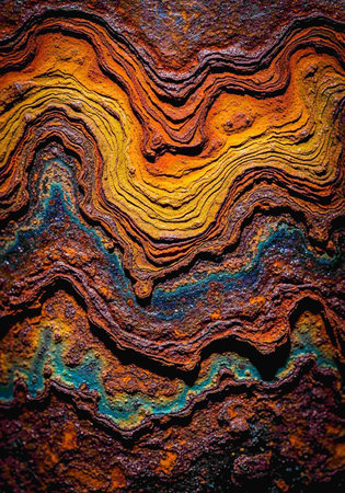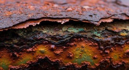Extreme close-up of layered rust and corrosion on a metal surface, showing intricate textures and vibrant orange and brown hues.