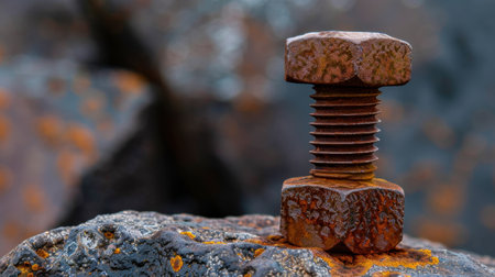This close-up image captures a rusty bolt and nut resting on a textured surface, revealing the natural wear and corrosion of metal over time.