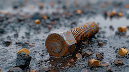 A close-up view of a rusty metal bolt lying on a wet surface, surrounded by gravel and small stones, showcasing unique textures and weathered details.