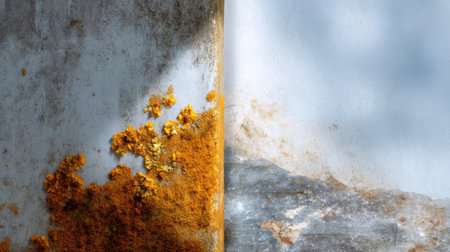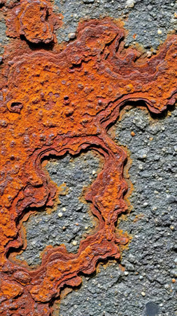 A unique combination of orange rust bleeding into gray porous concrete. Symbolizes urban decay, industrial history, and the intersection of different materials.