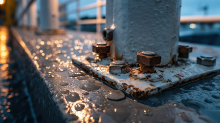 A rusty metal pole with bolts on it. The bolts are rusted and the pole is wet