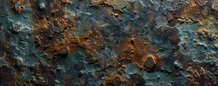 Macro view of heavily rusted metal with peeling paint, showing intricate textures and colors of corrosion.