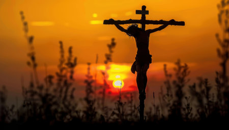 Silhouette of Jesus Christ on cross against sunset sky, Christian faith, hope, and resurrection concept