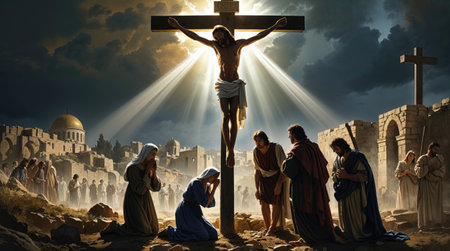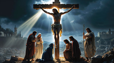 Dramatic scene of Jesus Christ's crucifixion on golgotha, with mary magdalene, virgin mary, and apostles mourning and praying at the cross under dark clouds and rays of light