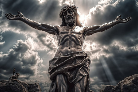Black and white photo of a Jesus Christ statue on the cross, symbolizing sacrifice and Christianity, against a cloudy sky.