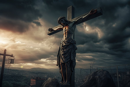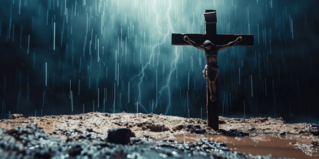 A powerful image of Jesus Christ on the cross with a dark stormy sky, symbolizing sacrifice and redemption