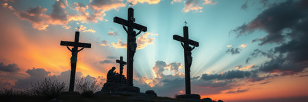 Good Friday banner and Poster with silhouetted dark image of the Crucifixion of Jesus Christ and the two thieves on Golgotha or Calvary. Generative AI