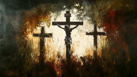 Three wooden crosses stand against a dark backdrop, showcasing Jesus crucified in poignant detail, evoking deep emotion through dramatic lighting and textured brush strokes.