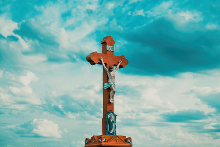 Old roadside crucifixion monument against dramatic sky, selective focus