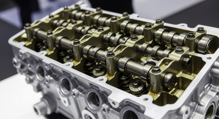 Detailed view of an automotive engine cylinder head, highlighting the intricate valve train, camshafts, and timing components. mechanical engineering and precision manufacturing.