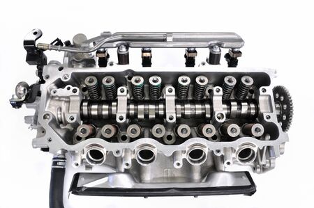 Open engine block exposing the interior parts and springs, service and maintenance concept in garage