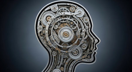 A human head with a toothed clockwork mechanism. The concept of thinking, decision-making.