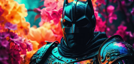 Cyborg man in black armor and helmet with pink flowers on background