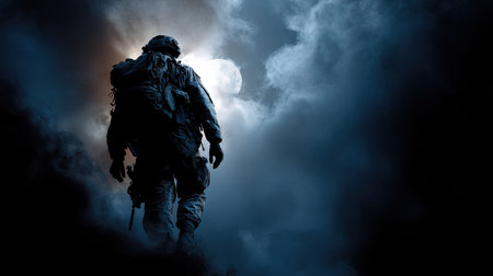 A soldier is seen walking towards an ominous moon. The image features a dark, shadowy silhouette, set against a backdrop of moody clouds and celestial light. The overall composition suggests a somber tone, perhaps suitable for themes of struggle or resilience. This image could be used for various editorial and design purposes.