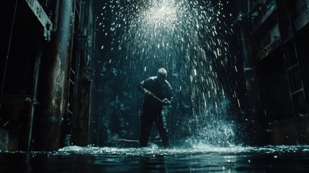 A striking image captures a silhouetted worker standing in shallow water, surrounded by cascading water droplets in a dimly lit industrial space.