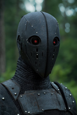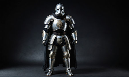 Medieval Knight in Full Metal Armor with Chainmail on a Dark Background.