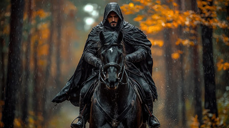 A lone, hooded rider and his dark stallion journey through a rainy, golden-hued autumn wood. His determined gaze suggests an epic, mysterious quest.