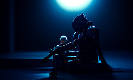 Futuristic warrior and child sitting under glowing light