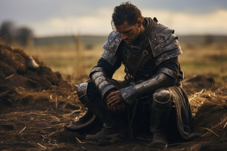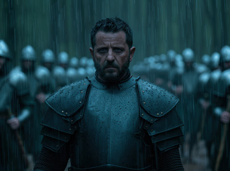 Grim warrior standing in the rain