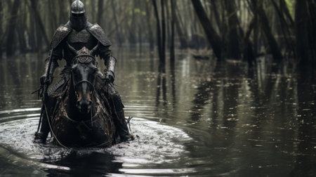 a man in dark armor rides on a horse through a serene lake, creating a captivating scene reminiscent of a historical drama. the atmospheric woodland imagery adds to the mystique of this national geographic photo. shot with a voigtlander bessa r2m camera, this concept art showcases the southern gothic aesthetic with its haunting beauty. with 20 megapixels, the details of this image are truly mesmerizing.