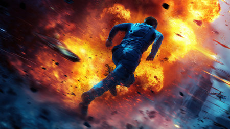 Dynamic action shot of athletic man in running through explosive orange dust cloud with dramatic lighting.