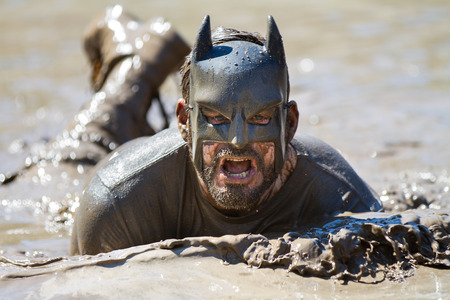 BOISE, IDAHO/USA - AUGUST 10: Runner dressed as batman swims in the mud during the The Dirty Dash in Boise, Idaho on August 10, 2013