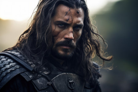 photo of strong ancient male warrior with roman armor stained, generative AI