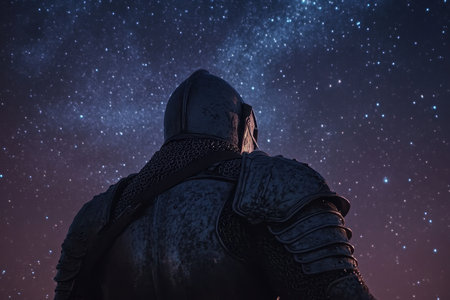 A knight in armor stands against a backdrop of a stunning star-filled sky, evoking mystery and wonder.