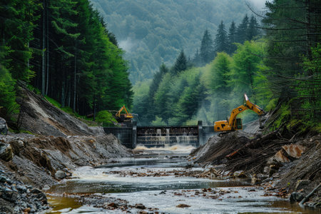 Dams Dismantling, Repair of Dam, Destroyed Dam on a River in Forest, Generative AI Illustration