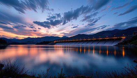 A scenic image of a dam during sunset, with warm light illuminating the structure and casting long shadows over the water, creating a serene and dramatic effect