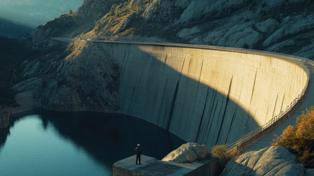 A stunning view of a dam reflecting in calm water, surrounded by rocky mountains. A person stands on the edge, enjoying tranquility in nature's grandeur.