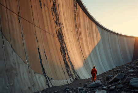 Dam inspector at spillway. Engineer inspecting dam spillway construction, hydroelectric power infrastructure.