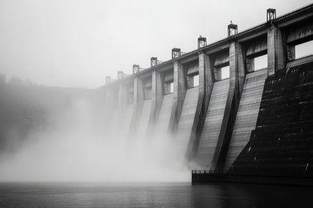 a majestic hydroelectric dam towering against the backdrop of cascading water, highlighting its capacity to harness the energy of fast-flowing streams for clean power generation